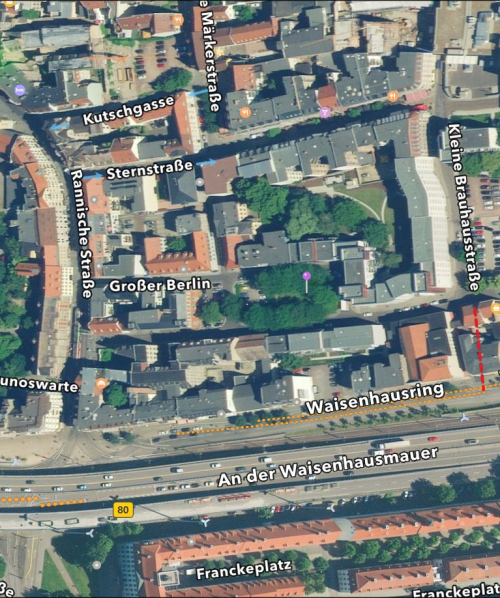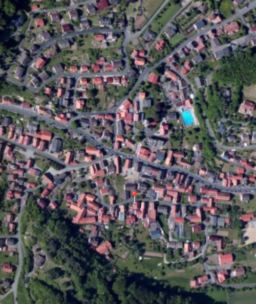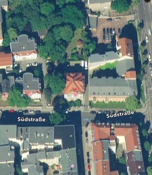 The house that belonged to my mother’s uncle & aunt, Adolph & Therese Pfifferling, Sudstrasse (South Road) 63, where the red pin is. The house had been used as a day care center for seniors, etc. (It has been moved to a larger building)