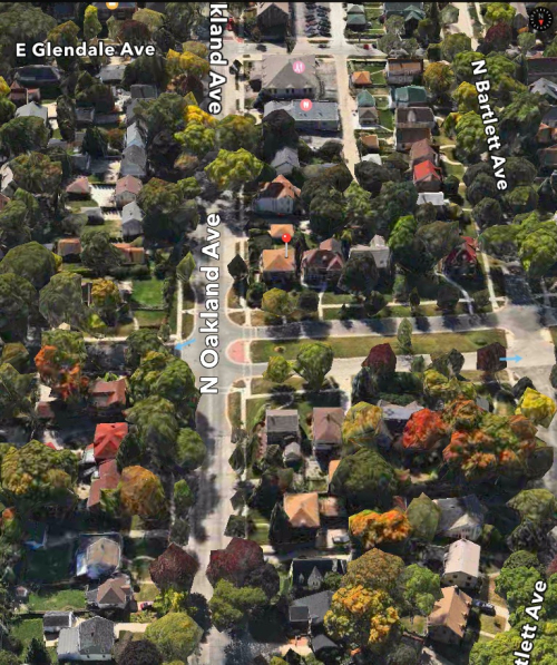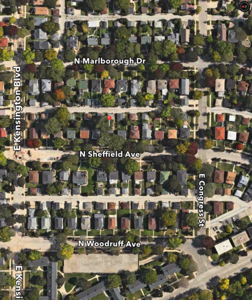 This is an image of our home at 1729 E. Cumberland Blvd (the red pin). in Whitefish Bay. We moved there in 1956 and were the first owners. My mother sold the house in 1985. The lot that our house was built on had been part of the property of our next-door neighbor, Dr. Guzetta.