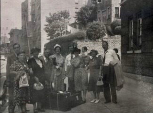 This picture was taken on August 30, 1938, the day that my father and his family arrived in America, in The Bronx where the Jacobsohn and Samenfeld families settled, 2710 Sedgwick Ave. My father Erich Samenfeld is on the far left. Oma Dina Samenfeld is third from the left. Tante Irma Jacobsohn is holding my cousin Peter, who was 6 months old. My Uncle Walter Jacobsohn took this picture.