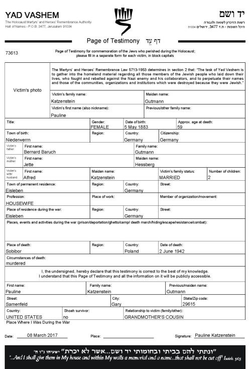 Pauline Katzenstein was my Oma Jukchen’s first cousin.