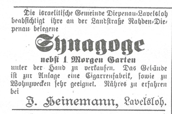 The Israelite community Diepenau-Lavelsloh intends to sell its synagogue and 1 acre of garden on the road Rahden – Diepenau. The building is very suitable for building a cigar factory and for residential purposes. More information can be obtained from I. Heinemann, Lavelsloh.