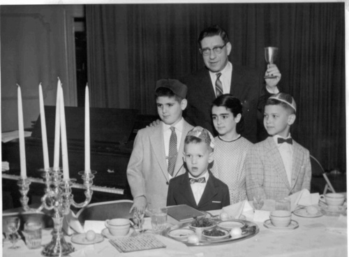 This photograph was taken at the New Home Club’s Passover Seder, April 16, 1957. From left to right: Rick Florsheim, my brother Dennis Samenfeld, my cousin Sandy Baer, and me Gary Samenfeld. Standing behind us is Dr. Herman Weil who led the Seders every year. This photo was in the Milwaukee Sentinel and there was also an article about the New Home Club, whose members were primarily the families of Jews who had escaped from Nazi Germany and found their new freedom in the United States. My father was interviewed in this article: Commented Erich Samenfeld of 1729 E. Cumberland Blvd. a livestock dealer, who emigrated from northern Germany in 1938: “Those who have desperately needed a helping hand know best the needs of others in similar situations.” My Uncle Walter Jacobsohn was President of The New Home Club for 20 years.