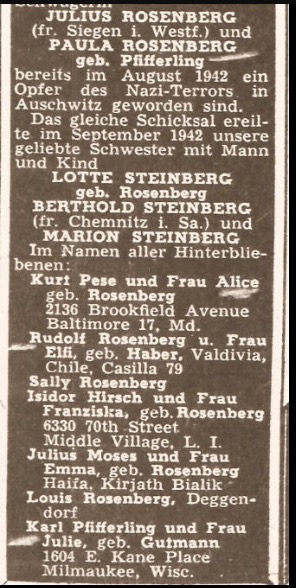 This is the obituary in the Aufbau for Julius & Paula Rosenberg. There is an error as they died in Treblinka. Their daughter, Charlotte, and her family were to die in Auschwitz. All five perished in 1942.