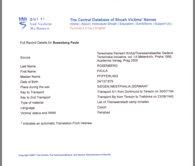 Paula Rosenberg was my mother’s aunt and Opa Karl’s sister. Her husband was Julius Rosenberg. They had 3 children Rudy, Alice, and Lotte. In August of 1942, my mother’s aunt and uncle, her cousin, Lotte, and her husband Bertold Steinberg, and their little girl Marion all perished in the gas chambers of the Treblinka and Auschwitz Concentration camps. Rudy emigrated to Chile and Alice to Baltimore. This is all mentioned in the story that my mother wrote. I have received a letter from Pia Rosenberg of Fredericia, Denmark which states: In letters from family is written that Julius and Paula were deported to Treblinka. According to Yad Vashem Transport List, Julius and Paula were taken from Theresienstadt to Treblinka in September 1942. Lotte, Bertold, and Marion Steinberg were in South France. Hans Pfifferling, Opa’s nephew tried to get papers for them so that they could come to America. Aunt Lore said that Opa Karl also worked on getting the papers but did not say anything at the time so as not to get anyone’s hopes up. Hans managed to get the papers but unfortunately too late the 3 of them were taken in France and deported to Auschwitz.