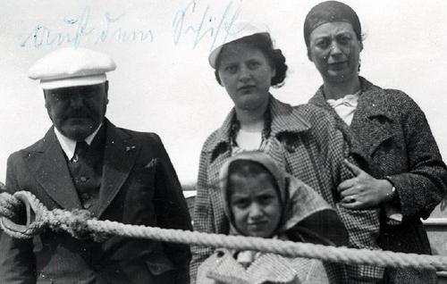This picture was taken on the ship that brought my mother’s family to America. As I mentioned in my speech, it was the last German boat that took Jews out of Germany, and my grandmother feared that the boat would turn around and take them back to Germany.In the foreground is my Aunt Lore, who was 8, then from left to right is my Opa Karl, my mother Hildegard, and my Oma Julchen. The looks on their faces speak for themselves.