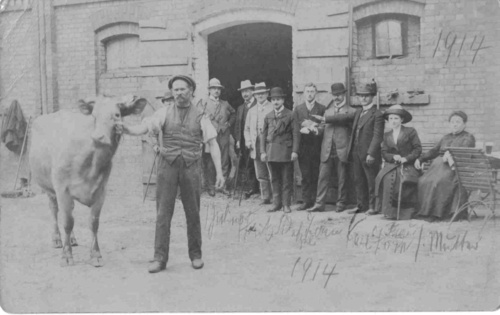 This is where my Opa Karl and his brothers had their cattle business. My mother and Opa are on the far right in this photo. My mother made the X on the picture.