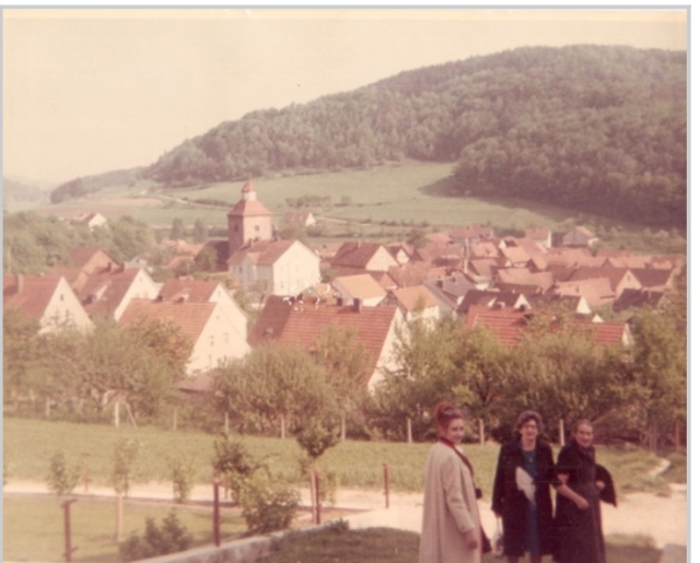 This is the town in Germany where the Pfifferling family was originally from. In my mother’s story, she says that it is near the Fulda River. My mother’s great-great-grandfather, Sander, her great-grandfather, Joseph, and her grandfather, Sander, were all born in Datterode. Joseph and his wife, Jettchen had 13 children. Their house, Brunnenstraße 24, is still known as “the 13-children house”. Opa Karl’s oldest sister, Meta, and older brother, Adolph were also born in Datterode. The family then moved to Wanfried, and then again to Halle/Saale. The woman in the center at the bottom of this picture is Opa Karl’s cousin Hilde Frank, who was born in Datterode and lived in Evanston, Illinois. Hilde’s father, Albert Pfifferling, and Opa Karl were first cousins.This picture was taken when Hilde visited Datterode in 1969. The other two women are Hilde’s sister Ilse Pfifferling, who emigrated to Argentina, and Christine Ronshausen, who lived in Datterode. Thomas Beck of Datterode identified them for me.