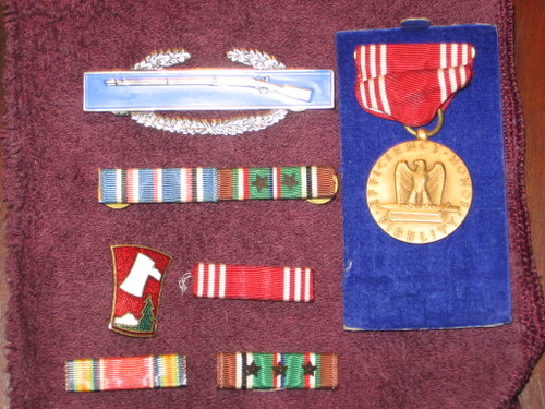 The long blue medal with the rifle and the wreath is the Combat Infantrymans Badge (CIB). Directly underneath the CIB, on the left is the American Campaign Ribbon, and on the right is the Victory In Europe Ribbon (star devices additional awards). Underneath these is, the 70th Division (his parent unit) on the left, and the Good Conduct Medal and Ribbon on the right. Underneath these is the WWII Victory Medal, and on the right is the European-African-Middle Eastern Campaign Ribbon (the stars are additional awards of the same medal).